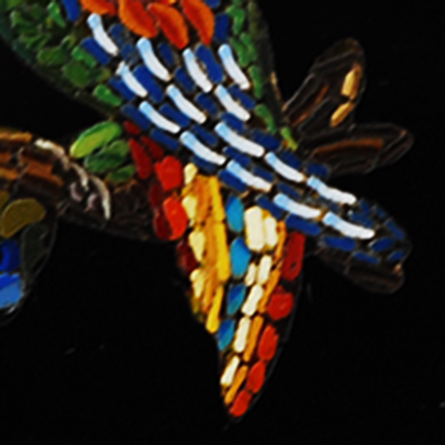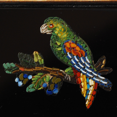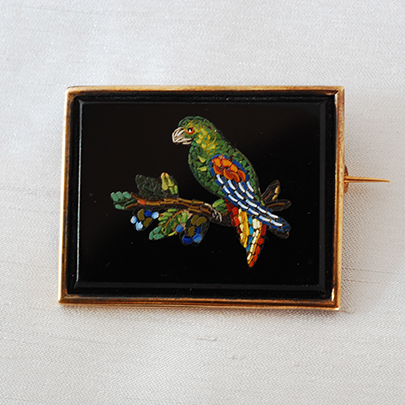 こちらのブローチは20種類以上の色ガラスを組み合わせて、インコだと思われる鳥が描かれています。