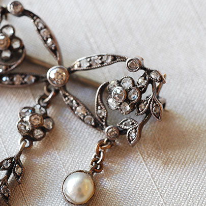 着用すると、垂れ下がるパーツが揺れる様子がとても優雅。ダイヤモンドも小粒ながらよく輝き、角度を変えて見ると小さな作品ながら立体的な意匠をこらしているのが分かります。