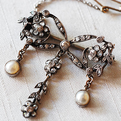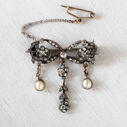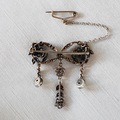 優雅な曲線と花綱模様が愛らしくも美しいボウノットのブローチ。