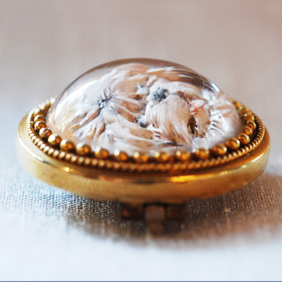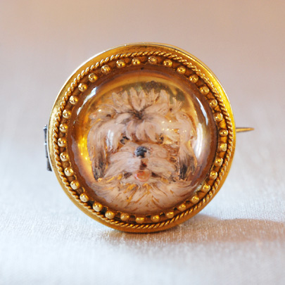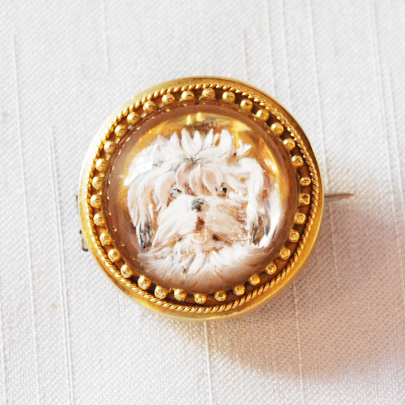 19世紀後半には新興のブルジョア階級が台頭し、乗馬、狩猟などのスポーツが盛んになりました。当時、犬はペットというより猟犬だったのでそのジュエリーを身に着けているということはステイタスでもありました。愛くるしい犬の表情に思わず笑みがこぼれてしまう作品です