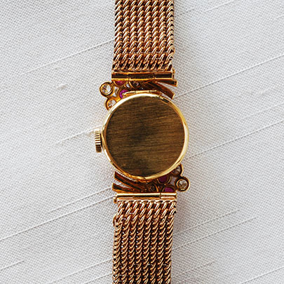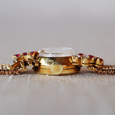 約10mmの小さなフェイスの上下にルビーとダイヤの花束が飾られている華やかなジュエリーウォッチ。