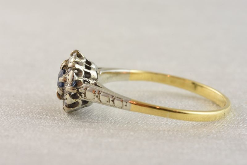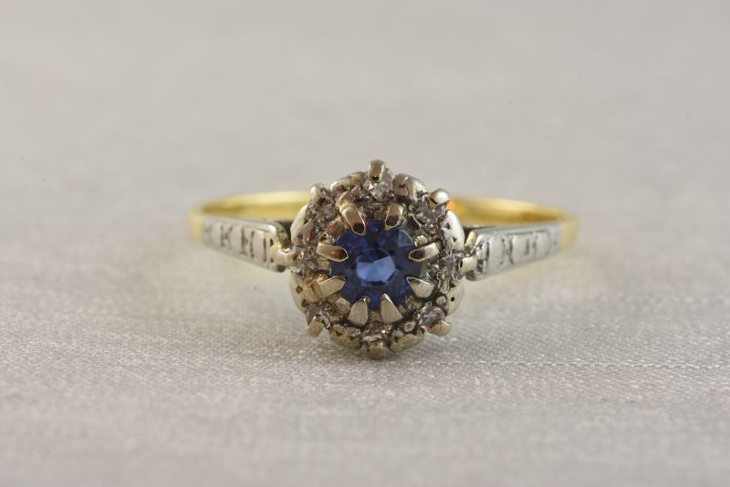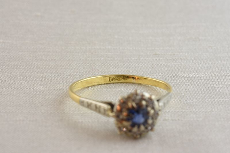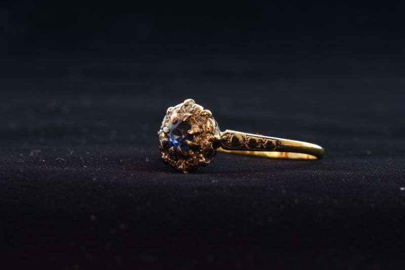 サファイアを中心にダイヤモンドで取り巻いたオーソドックスなクラスターデザインは