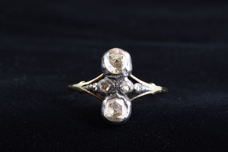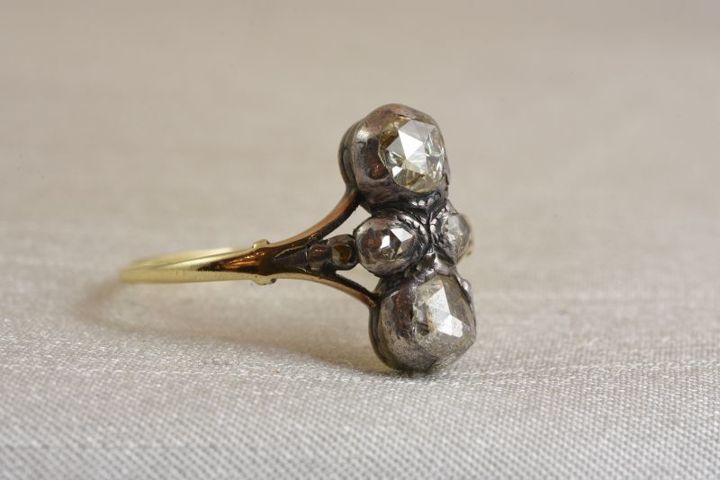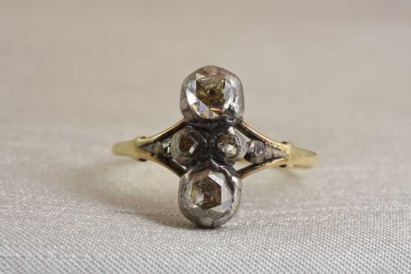 大小のローズカットダイヤモンドを上下左右対称にバランスよくデザインしたリング。