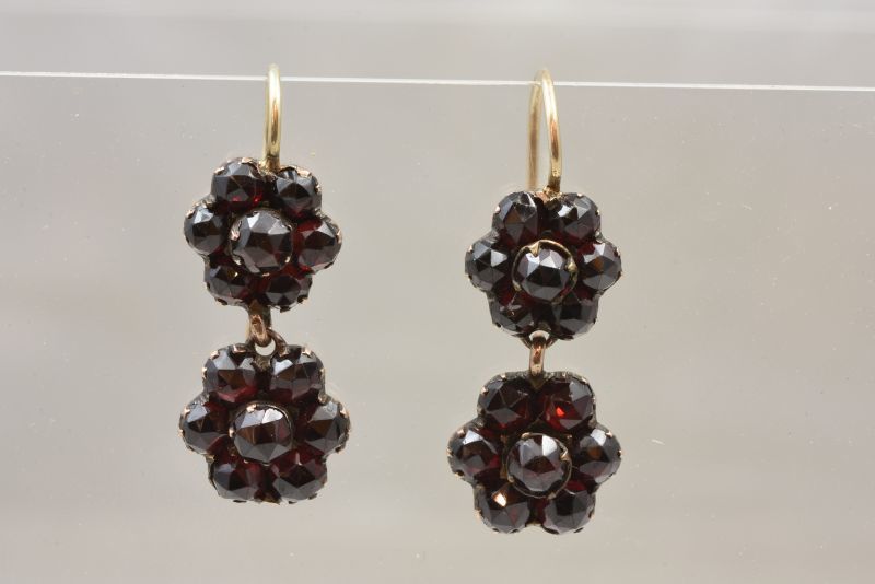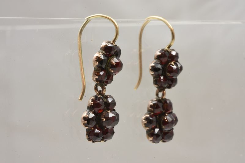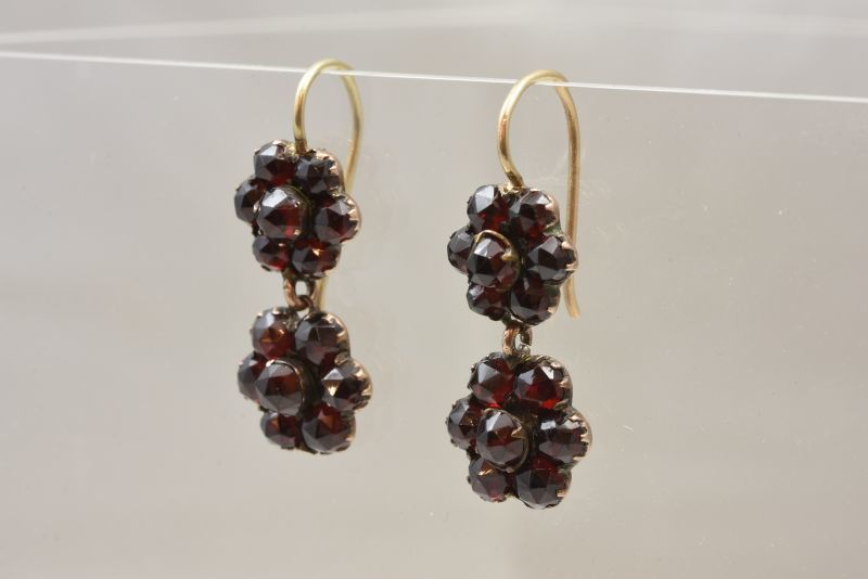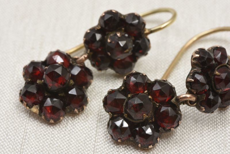 19世紀、ヴィクトリア女王が好んだことで人気を博し、この時代のジュエリーではよく見かけることのできるガーネットジュエリー。こちらのイヤリングに使われているのは、その中でも特に深い赤色を発するチェコのボヘミア地方て採れましたボヘミアンガーネットです。