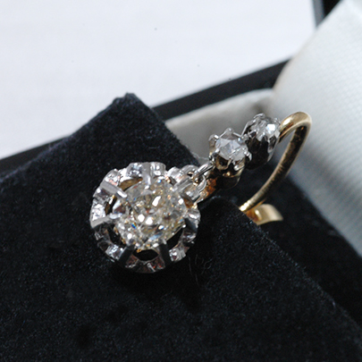 上部に付いている小粒の2石のダイヤはローズカット、メインのダイヤはオールドマインカットがセットされています。
