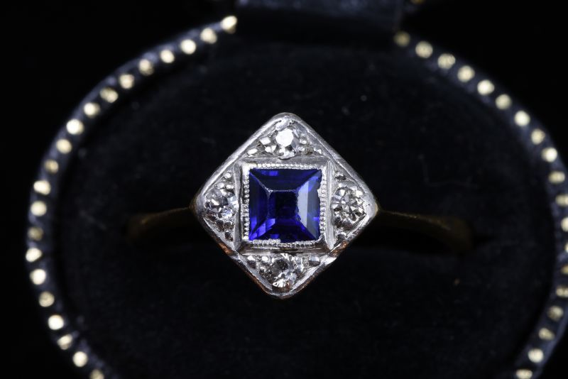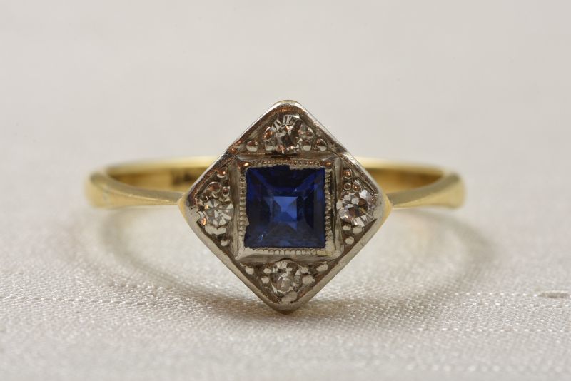 菱形のフォルムのセンターに、スクエアにカットされた透き通る深いブルーがとても綺麗なサファイアのリングです。