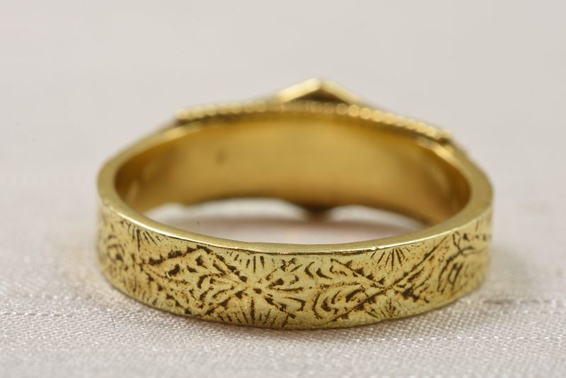 ゴールドリングの表面には、シダの葉のような模様がパターン化されて施されています。