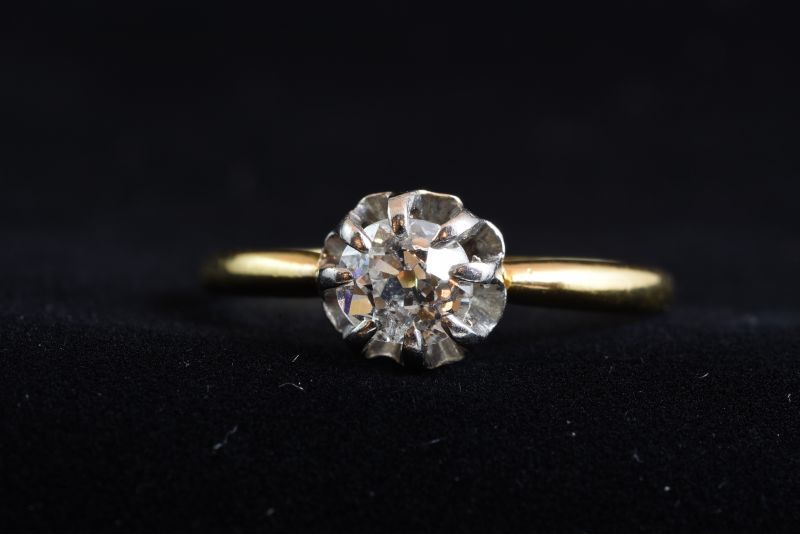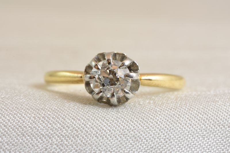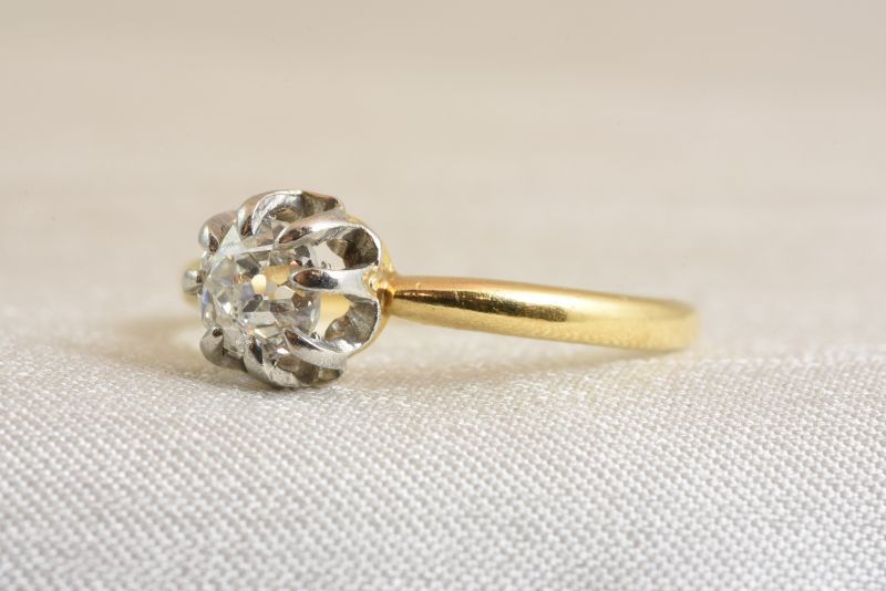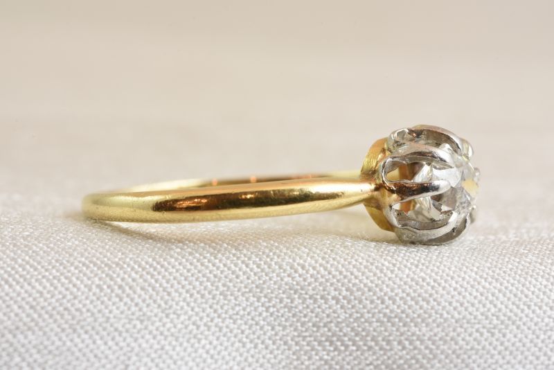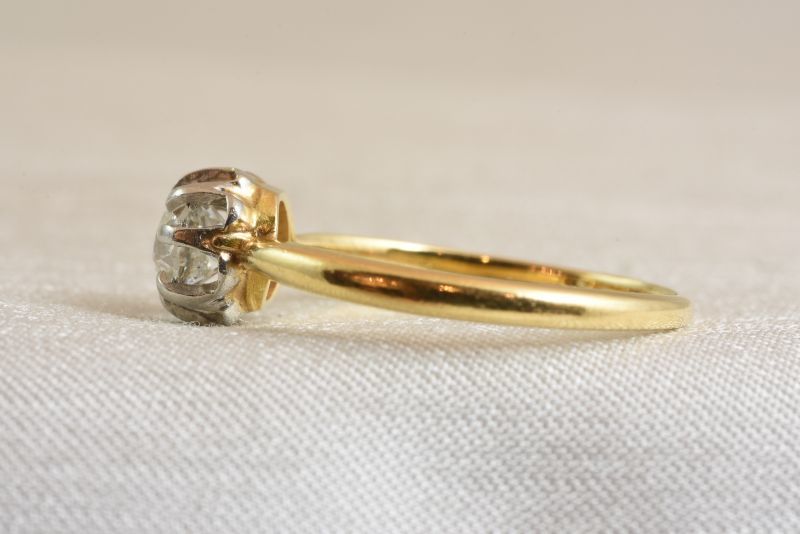 石の周りの白い金属と手に触れる台座やシャンクはゴールド色のコンビネーション。