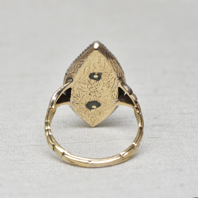 その裏面には、残念ながら表面のダイヤをセットしている銀台が緩んでしまったのでしょうか、