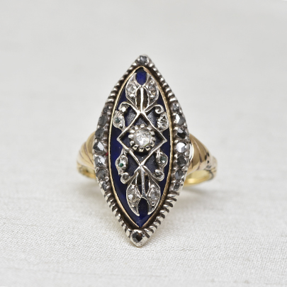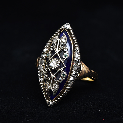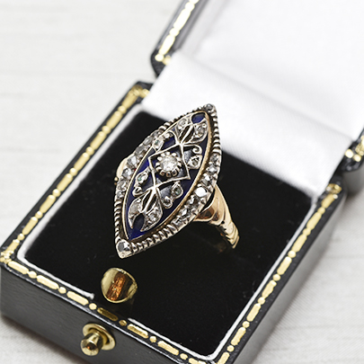 ロイヤルブルーのブリストルガラスと、銀台にセットされたローズカットダイヤモンドとのコントラストが美しいリングです。