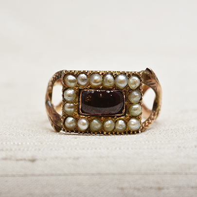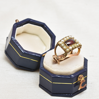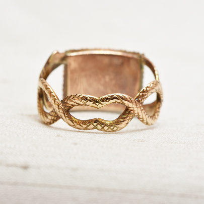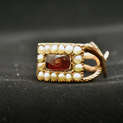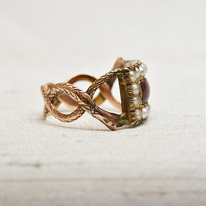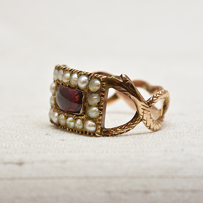 19世紀初期のジョージアン期に作られました、絡み合った二匹のヘビのシャンクに支えられているガーネットとパールのリングです。