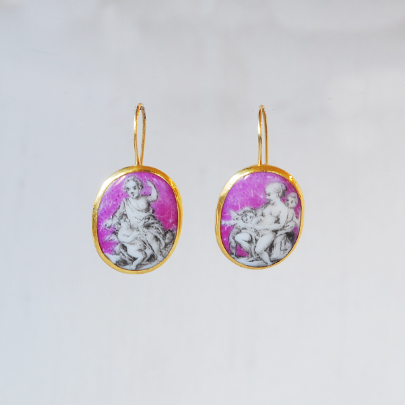 左右それぞれ違ったテーマの絵が描かれています。向かって左側のイヤリングは、エンジェルと青年が何かに腰かけていますね。