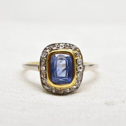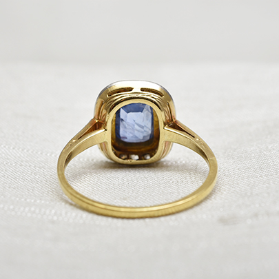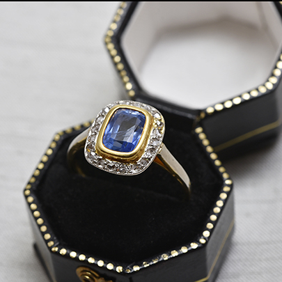 ゴールドの縁取りは、クールになりがちなサファイアに温かみをプラスしており、