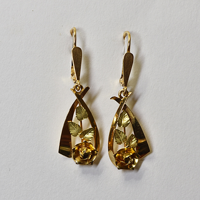 薔薇の花は三角形のベースよりさらに濃いオレンジにも見えるイエローゴールド、葉はグリーンゴールドで仕立てられているため、より立体感を感じます。