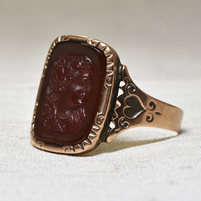 ふっくらとした頬、すっきりとした鼻筋の通った可愛らしい女性の横顔が彫られたアメリカのカメオリング。
