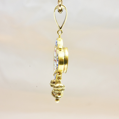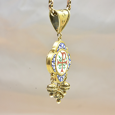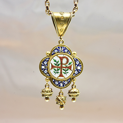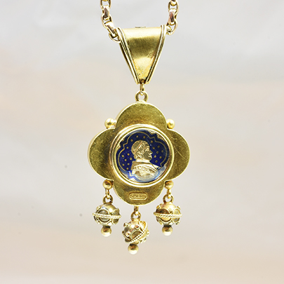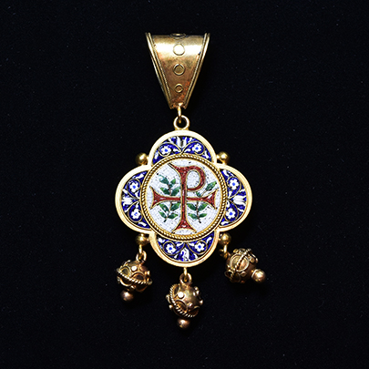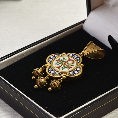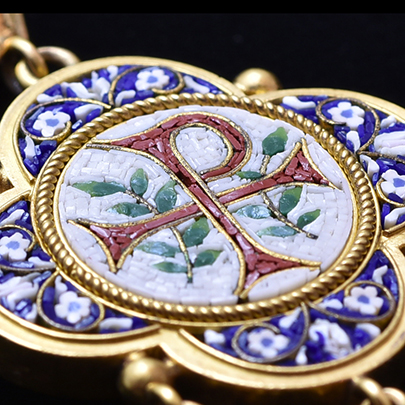 ブルーを背景に描かれているのは、チューリップと勿忘草でしょうか、1mmにも満たない程の小さなガラス片を使って、気の遠くなるような作業にによって作られたモザイクペンダントです。