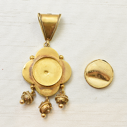 ペンダント裏面センターに押されているマークはメーカーマークだと思われますが、申し訳ございません、確認が出来ておりません。