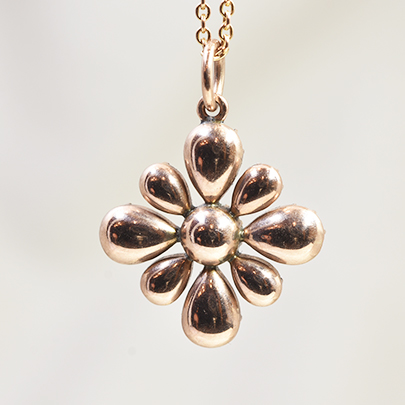 この時代のデザインによく見られるフラットにカットされたガーネットを、花のようなモチーフに仕立てています。