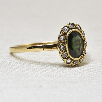 しかい動いて、光が入ると緑に輝く魅力的なサファイアリングです。