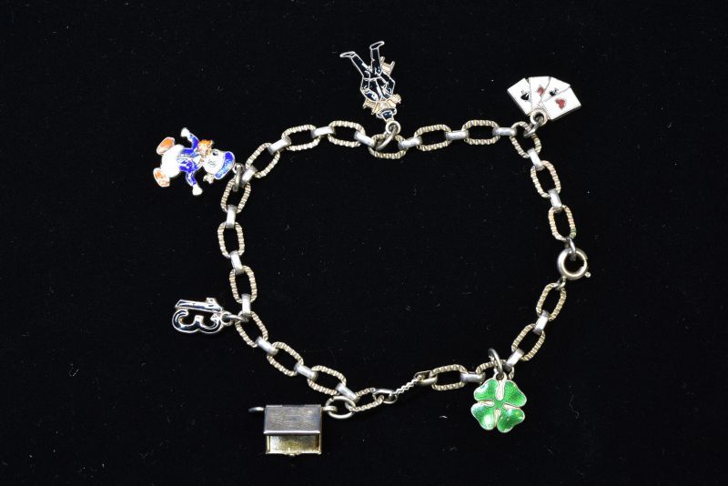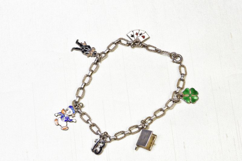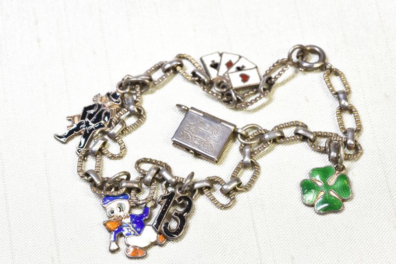 トランプカードや煙突掃除人(ドイツやオーストリアでは幸運の象徴)にドナルドダックでしょうか。13という数字のチャームが下がっていますので13歳の記念に贈られたものかもしれません。ハートのしおりが下がったブック型チャームは開閉できます。ラッキーアイテムの四葉のクローバーのチャームもついています。