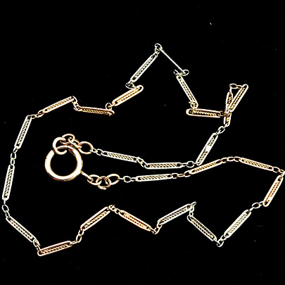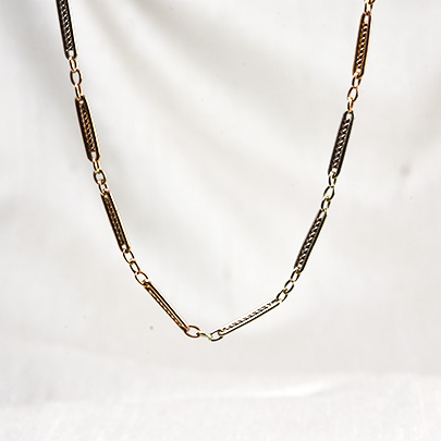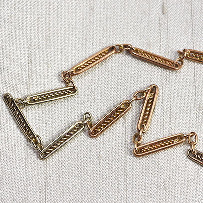 撚線状の金を囲んだ細長いパーツを、アズキ状のチェーンで繋いだお作り。