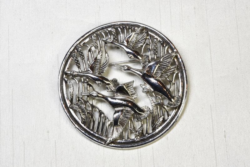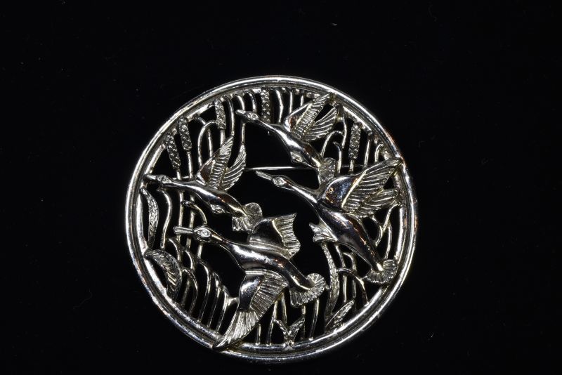 シルバー色がクールな印象で男性にもお勧め。大振りなブローチはニットから厚手のコートまで合わせていただける存在感と個性のあるアイテム。ガマの草原上を鴈が飛ぶ様子が躍動的に表現されています。雁は遠方へ隊列をなして飛翔することから天地を結ぶ象徴や戻ってくるという習性から、無事に帰るといった意味合いもあります。