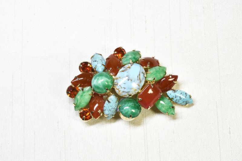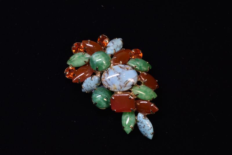 天然石の様な模様の入ったガラスストーンをすべて爪留めによりセットされたブローチ。