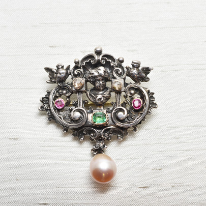 sold シルバー・エメラルド ルビー ダイヤ パール ブローチ