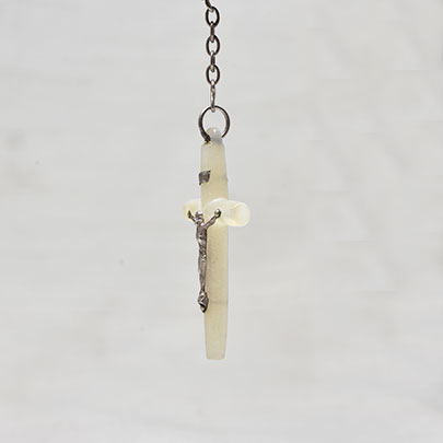 クロスに繋がるチェーンにはハートにカットされたマザーパール。