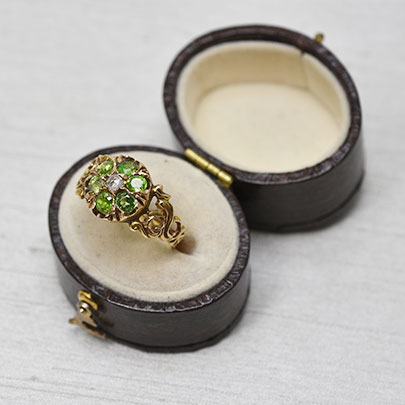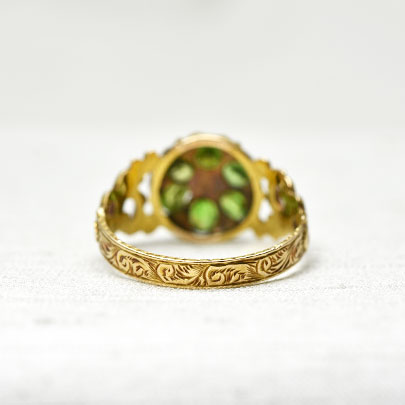 デマイントイドガーネットを贅沢に使って取巻いた