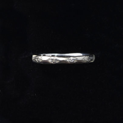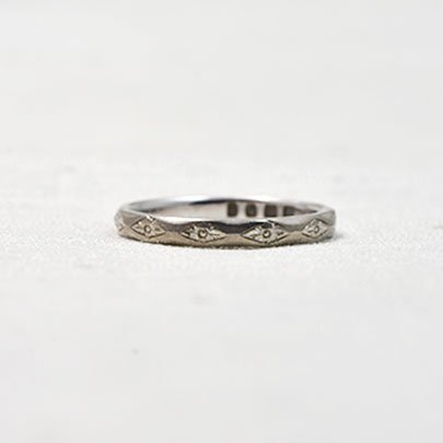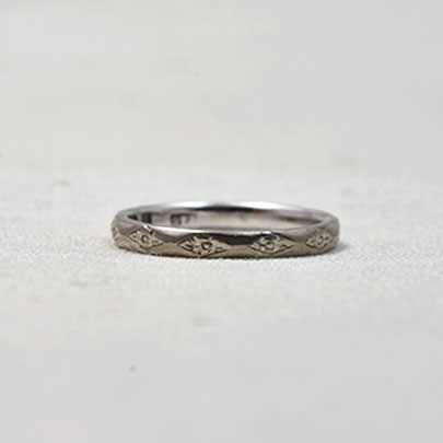 連続したひし形へ花模様が彫られているヴィンティージのエタニティリング。