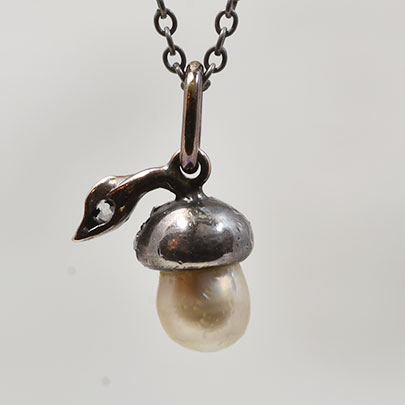 こちらのどんぐりペンダントは、帽子と葉の部分へ9石のローズカットダイヤが爪留めされた贅沢なもの。