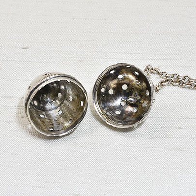 アンティークシルバーのしっとりとした輝きが美しいポマンダー、実用を兼ねてお洒落にお楽しみいただけます。