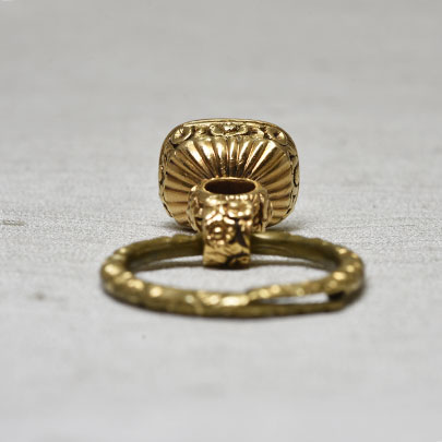 縦約7.5mm×横約9mmのサイズのコーネリアンには、今にも罠にかかるのではないかと思われるネズミとネズミ捕りが彫られています。