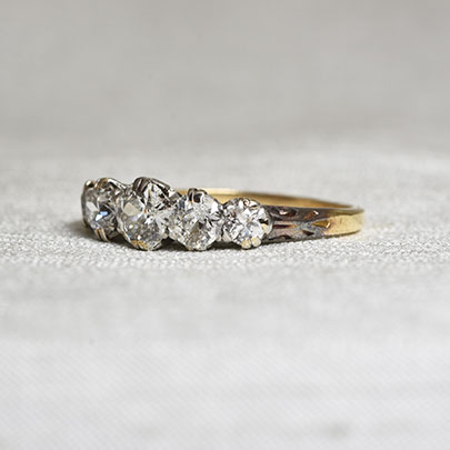 ダイヤモンドを支える爪はプラチナで、凝った唐草模様に立ち上がり