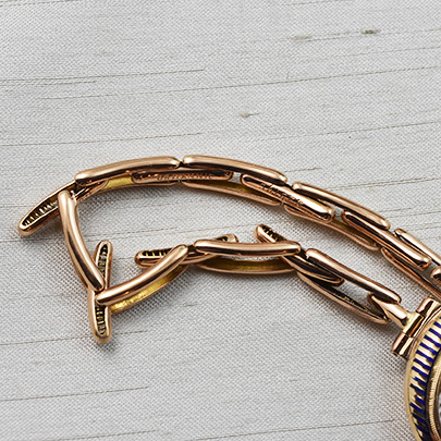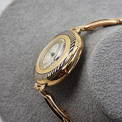 まるで だまし絵のようにブルーとホワイトのエナメルが描かれたお洒落な腕時計です(フェイスはほぼ新円です)