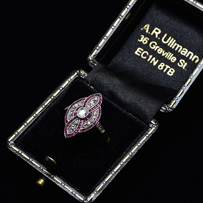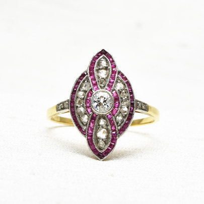 アクセントは、カリブレカットで留められたルビー。