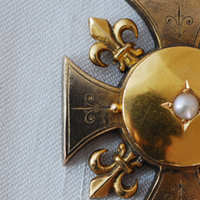 クロスパティに聖母マリアの象徴である百合の花とその涙を表すパールがあしらわれたロケットペンダント。