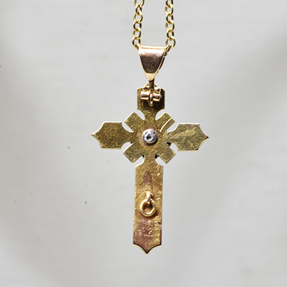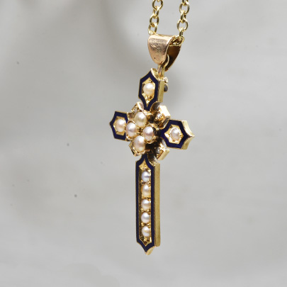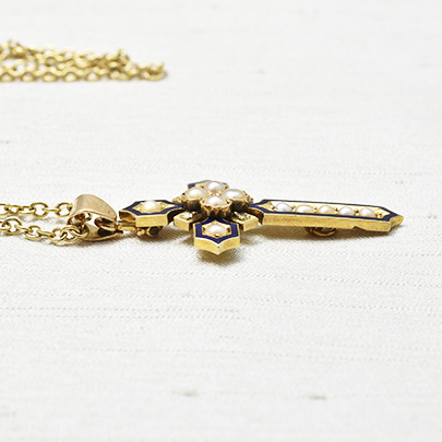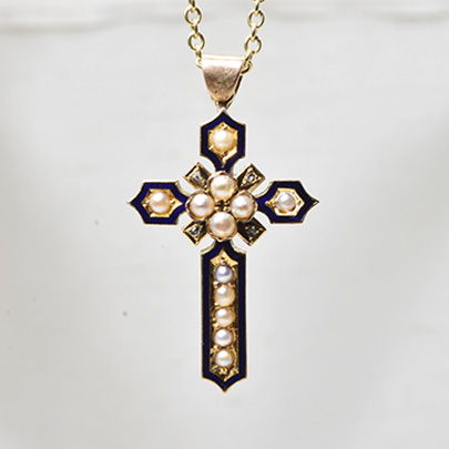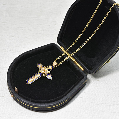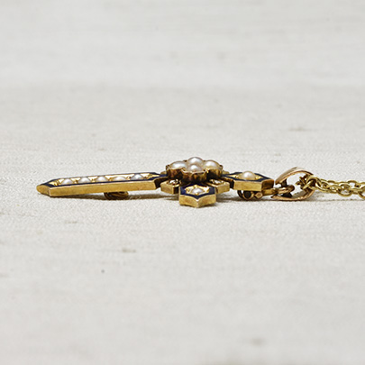 ミッドナイトブルーのエナメルがアウトラインに施された美しいクロスペンダント。