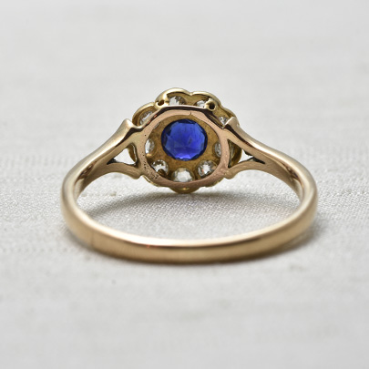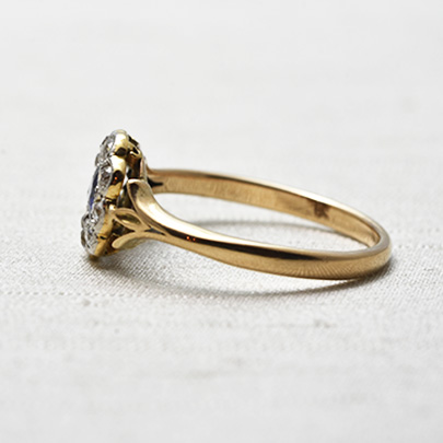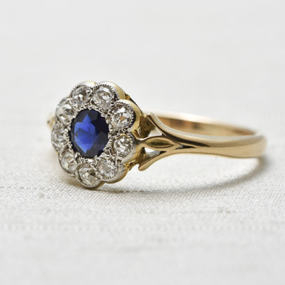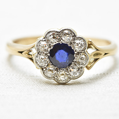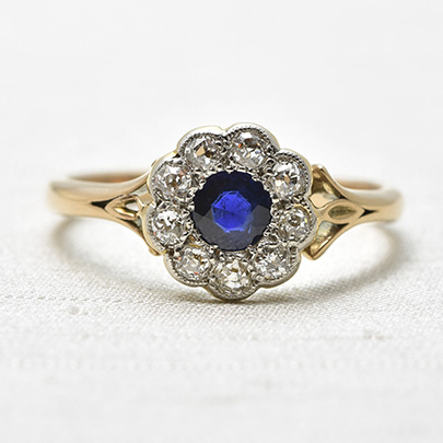 深く濃いブルーのサファイアの周りに、9石のダイヤが取り巻いたクラスターリング。