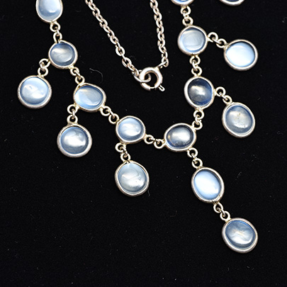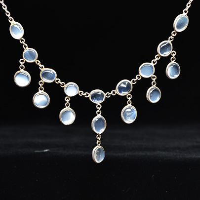月光のような、と例えられるムーンストーンを連ねたネックレス。