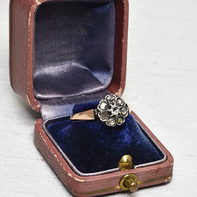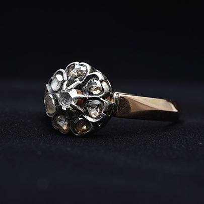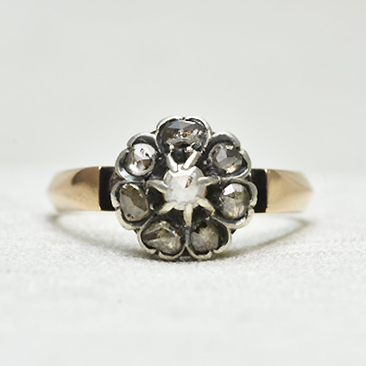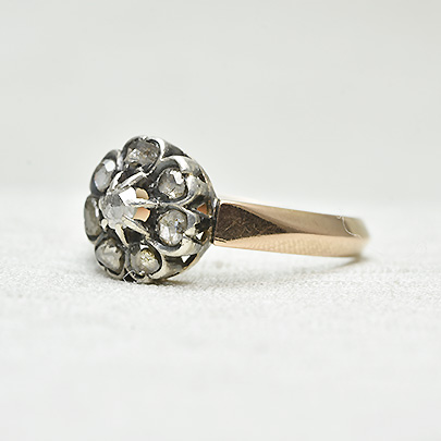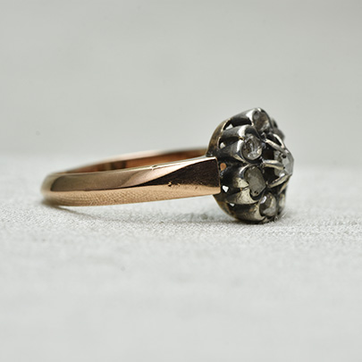 ダイヤモンドはローズカット、周囲の石はクローズドセッティング、中央はオープンセットです。