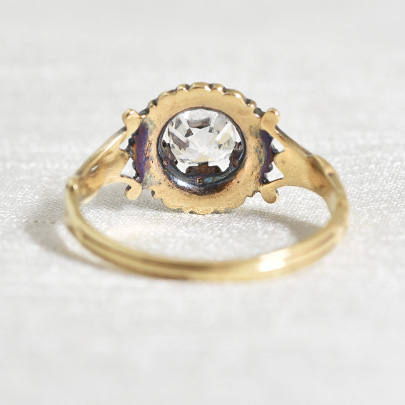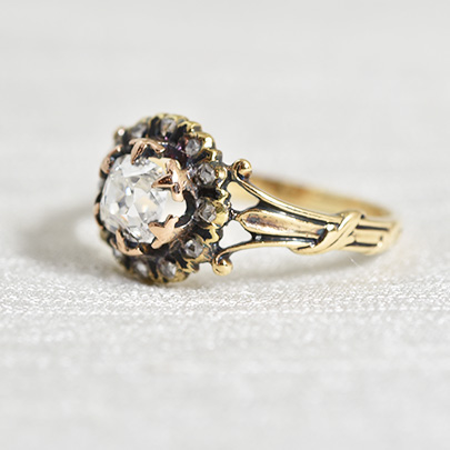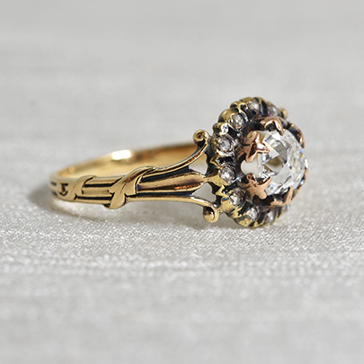 一段下がった位置に取り巻くメレダイヤはローズカット。