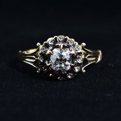 センターの大粒のオールドマインカットダイヤモンドは、高さもしっかりとありとても強くそして美しく輝きます。
