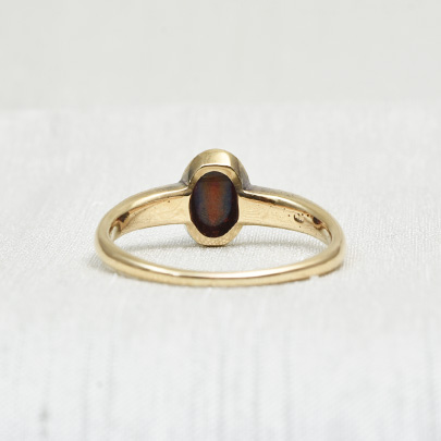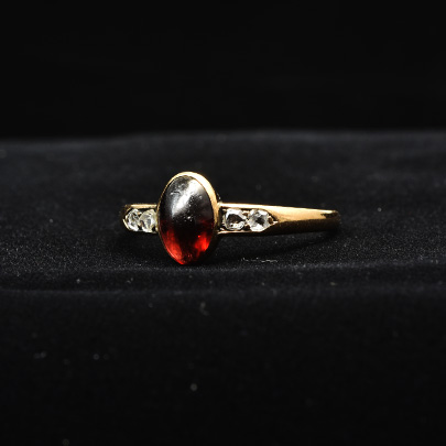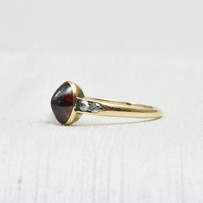 すっきりとしたフォルムに、古風な雰囲気の石を用いたリング。中央はカボションカットのガーネット、左右はローズカットダイヤモンドが2石づづ留められています。