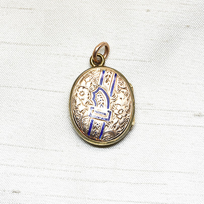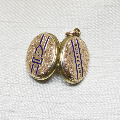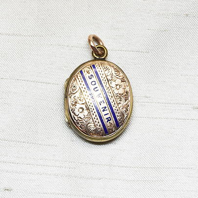 紺色のエナメルにてSOUVENIRの文字とベルトのような意匠が施されています。