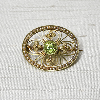 極小のパールをオーバルの枠に配し、ペリドットをセンターに金線や金花をあしらっています。