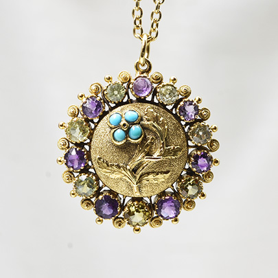 ターコイズを花びらへあしらい、ゴールドで躍動感ある茎や葉を表現した小花のモチーフが可憐なロケットペンダントです。