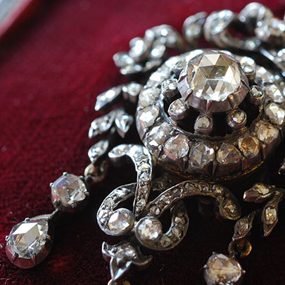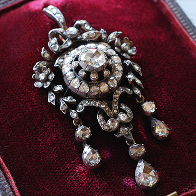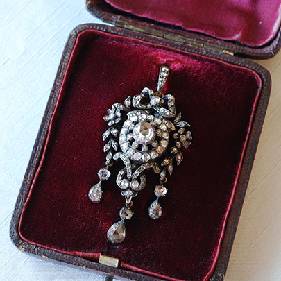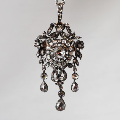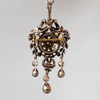 大粒のローズカットダイヤモンドと繊細な花綱模様のハーモニーが美しいペンダントブローチ。