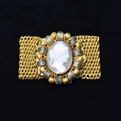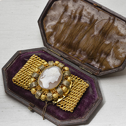 正面には美しい女性の横顔が彫られたシェルカメオ。